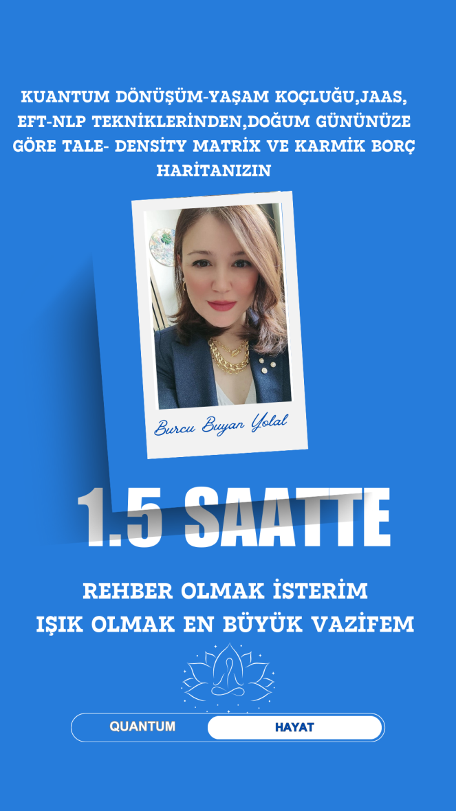 Kuantum dönüşüm-Yaşam Koçluğu,JAAS, EFT-NLP tekniklerinden,Doğum gününüze göre Tale- Density Matrix ve Karmik Borç haritanızın o anki ihtiyacına en uygun olanlar seçilerek çalışılan, ortalama 1.5 saat süren danışmanlık görüşmesinde kişinin bloke olan yaşam alanına ilişkin arınmaların, farkındalıkların ve dönüşüm çalışmalarının yapılmasıdır.